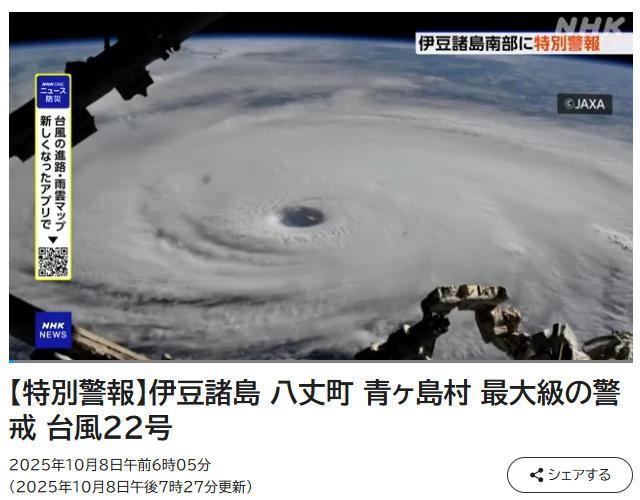 据日本气象厅消息,伊豆群岛可能出现因强风导致建筑物倒塌、因巨浪引发大范围浸水等数十年一遇的严重灾害,此外还可能发生山体滑坡、低洼地区浸水及河流泛滥等次生灾害,呼吁当地民众密切关注避难信息,并前往安全场所避险。