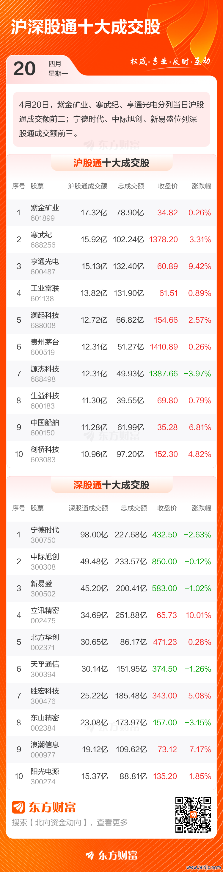 紫金矿业、寒武纪、亨通光电位列沪股通成交前三,成交额分别为17.32亿、15.92亿、15.13亿;宁德时代、中际旭创、新易盛位列深股通成交前三,成交额分别为98.00亿、49.48亿、45.20亿。